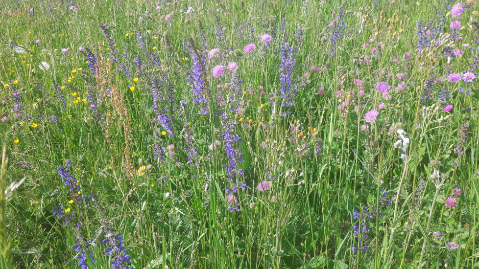 Wiesensalbei, Rotklee, Wiesenkerbel, Margarite, Skabiose, Kuckuckslichtnelke, Hornklee, Labkraut, Leimkraut…sorgen dafür, dass der Speisezettel der Wiederkäuer aufgewertet wird.