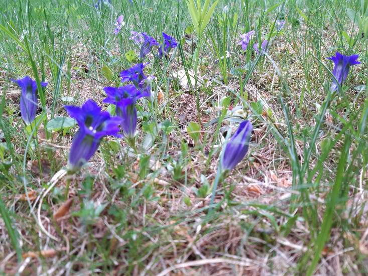 Himmelschlüssel, buchsbaumblättrige Kreuzblume, Fünffingerkraut, Lungenkraut und Veilchen strahlen um die Wette. Zwischendrin die tiefblauen Trichterblüten vom "Kuckucksschuh", hinter dem der großblütige Frühlingsenzian steckt. (1.Foto)
